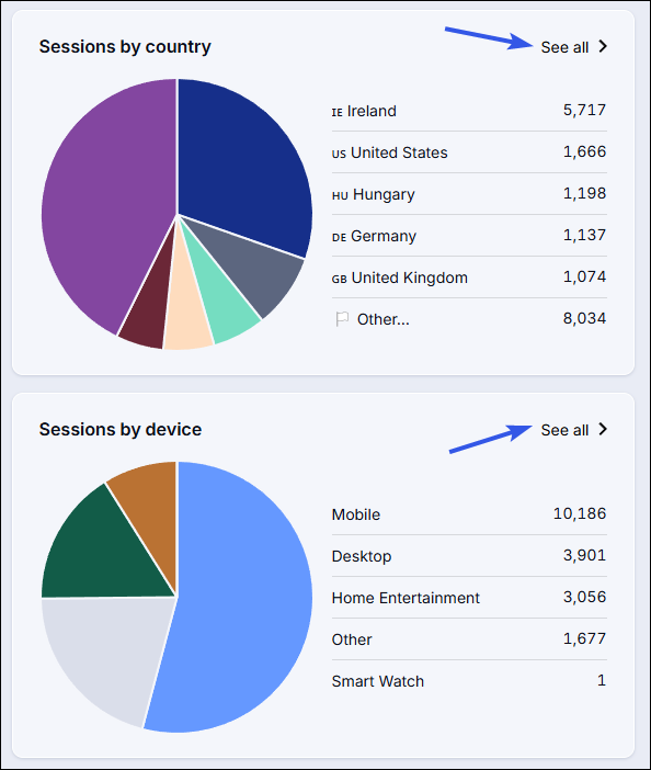 There is a “See all” link at the top-right of each pie graph which will redirect you to the Sessions tab.